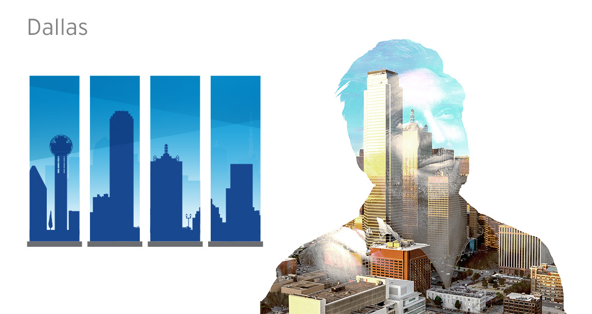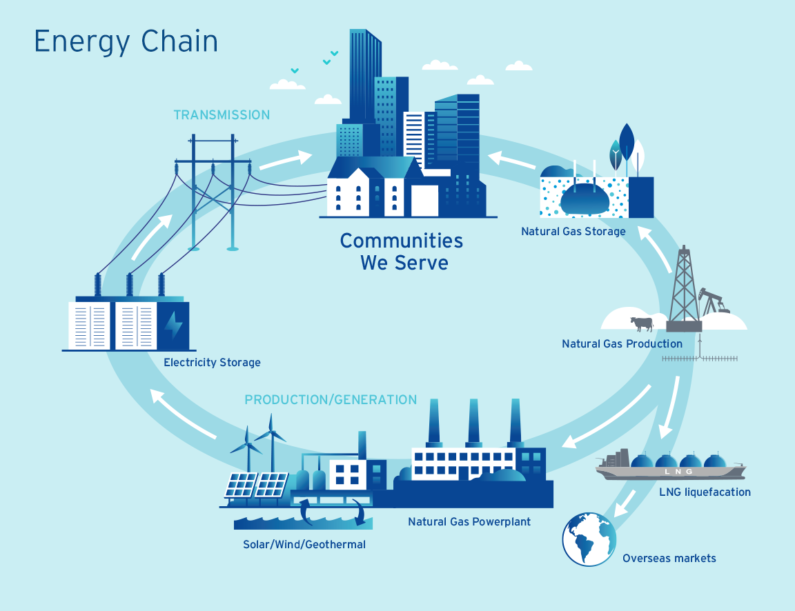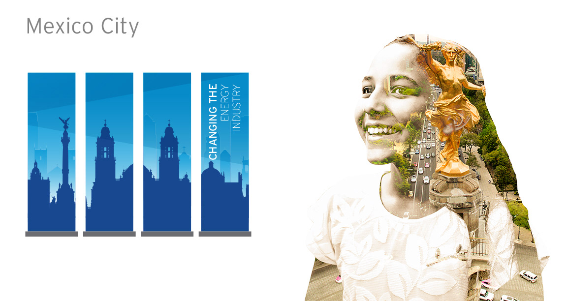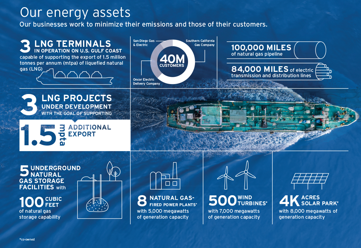 Conference signage and photographic illustrations celebrating the four cities of Sempra Energy. Supporting infographics depict the assets, process and company numbers.