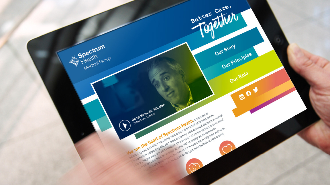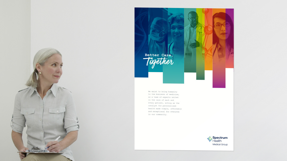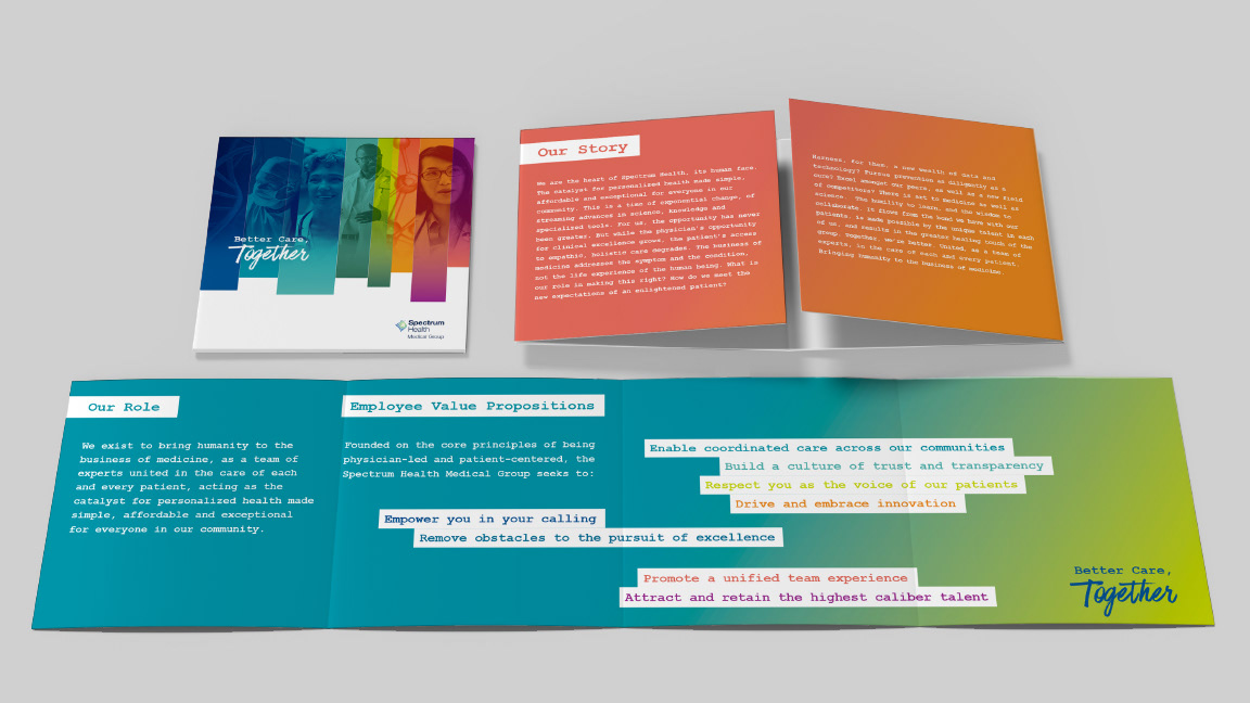 An internal campaign to galvanize the members of the Spectrum Health organization. Celebratory voice, tagline and colors create a engaging and uplifting brand message.