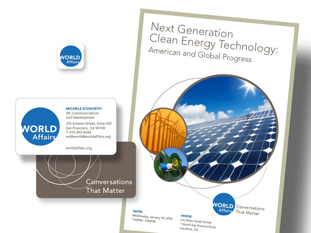 The objective of the project was to rebrand World Affairs Council of Northern California and it's three sub-brands to be more unified, modern, bold and attractive to a younger audience. The result is one clear brand with a new name WorldAffairs, that is visually executed in a bold circular shape that allows for adaptability for alternate logos with tagline, sub-brand names, and secondary logo usage.